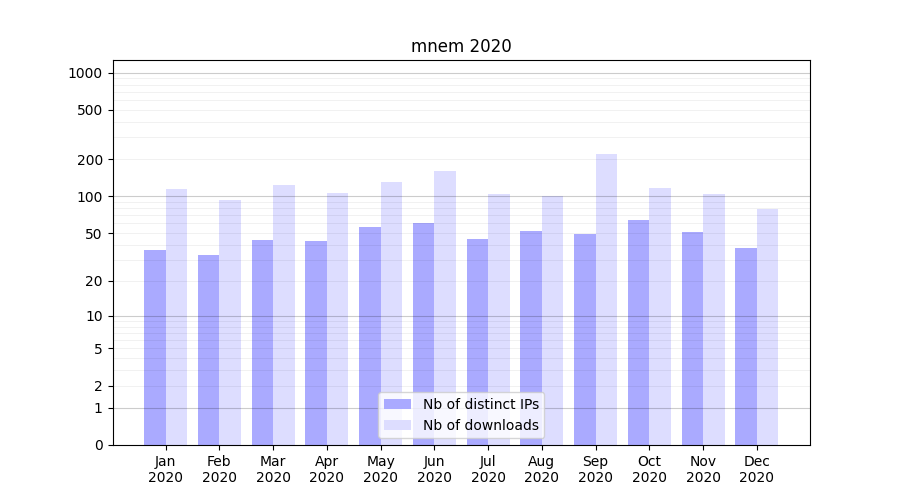 Number of downloads for software package mnem, year by year, from 2025 back to 2014 (years with no downloads are omitted):