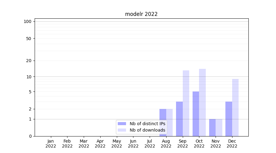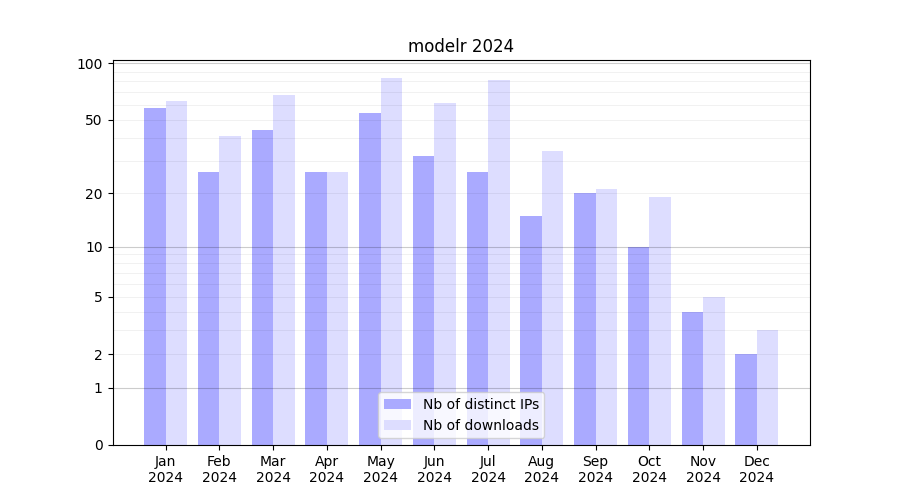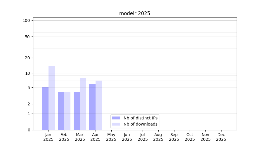 Number of downloads for software package modelr, year by year, from 2025 back to 2014 (years with no downloads are omitted):