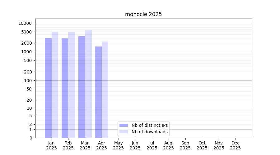 Number of downloads for software package monocle, year by year, from 2025 back to 2014 (years with no downloads are omitted):