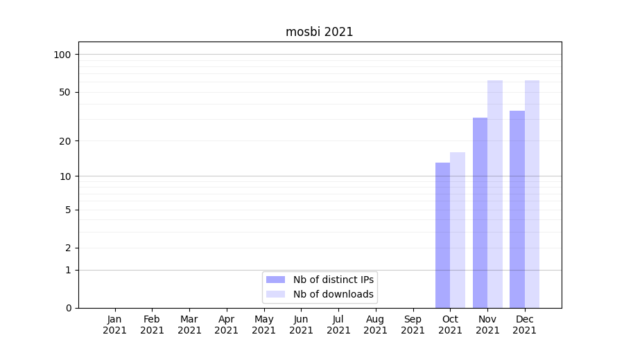 Number of downloads for software package mosbi, year by year, from 2025 back to 2014 (years with no downloads are omitted):