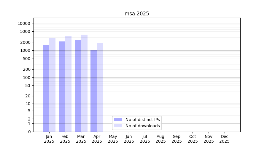 Number of downloads for software package msa, year by year, from 2025 back to 2014 (years with no downloads are omitted):