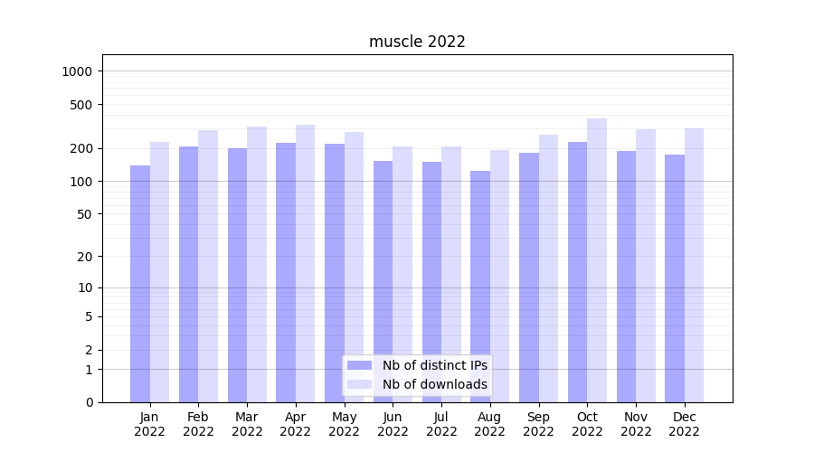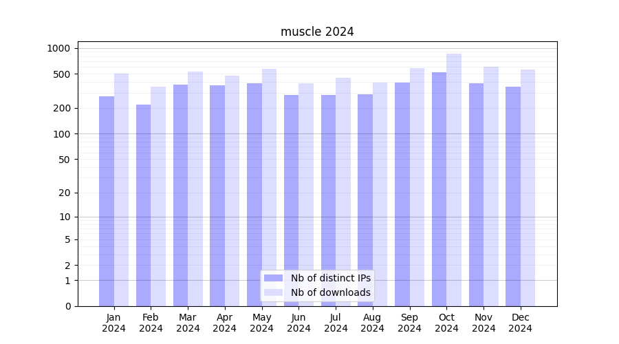 Number of downloads for software package muscle, year by year, from 2025 back to 2014 (years with no downloads are omitted):