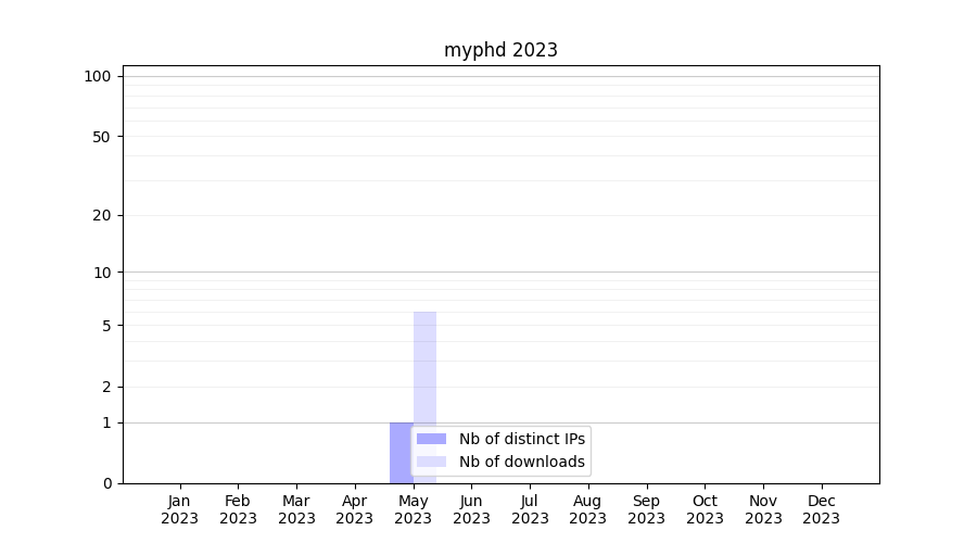 Number of downloads for software package myphd, year by year, from 2025 back to 2014 (years with no downloads are omitted):