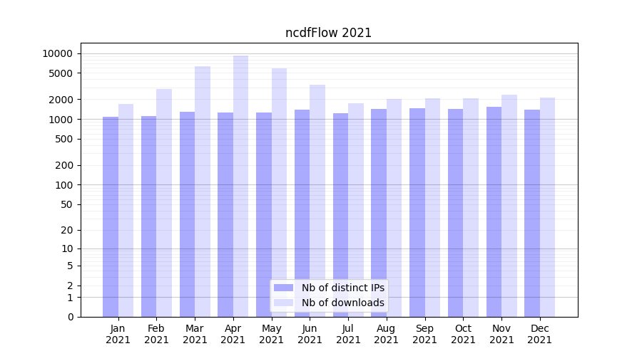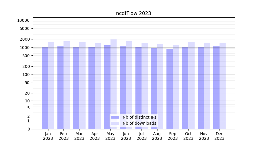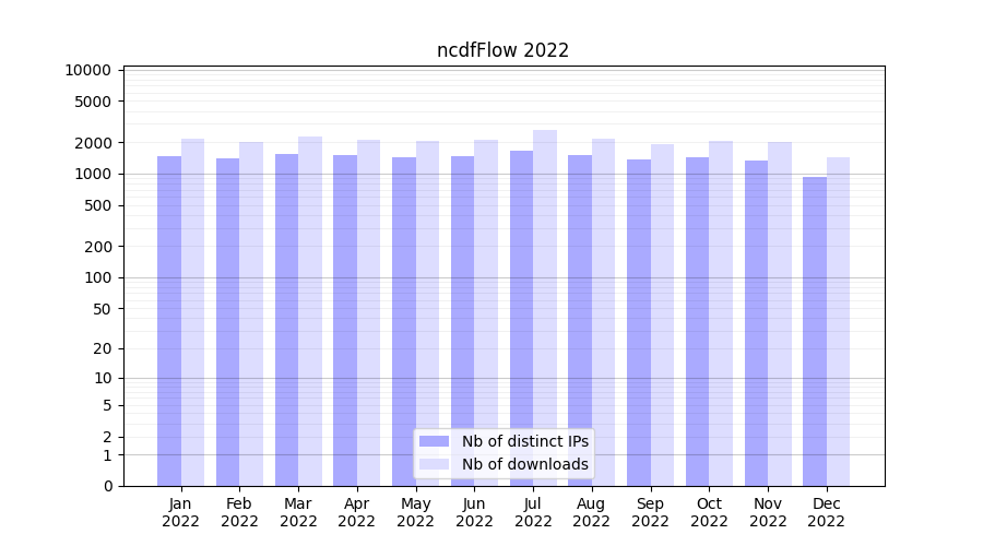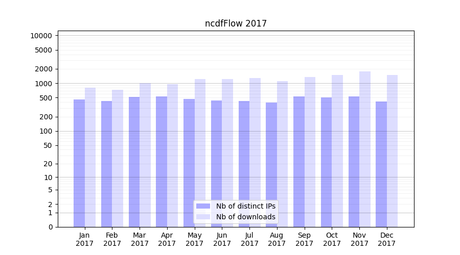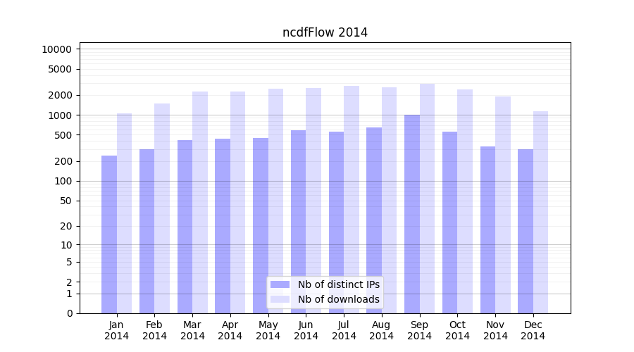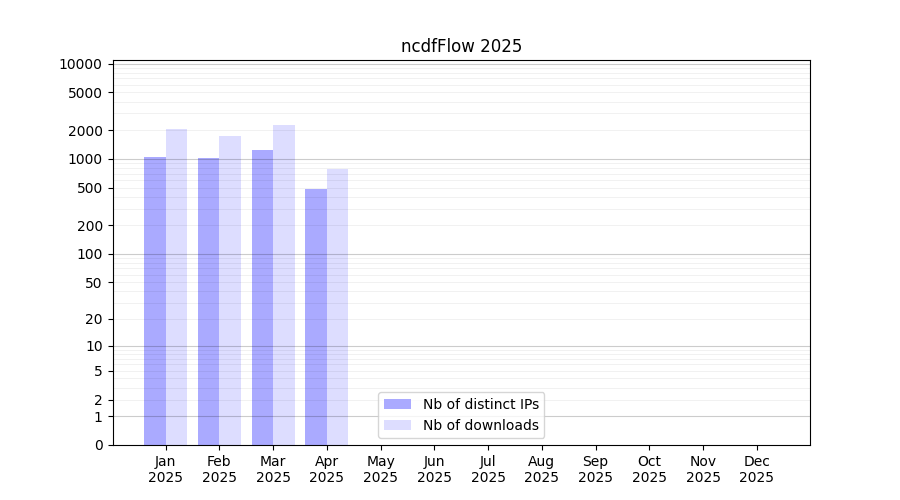 Number of downloads for software package ncdfFlow, year by year, from 2025 back to 2014 (years with no downloads are omitted):