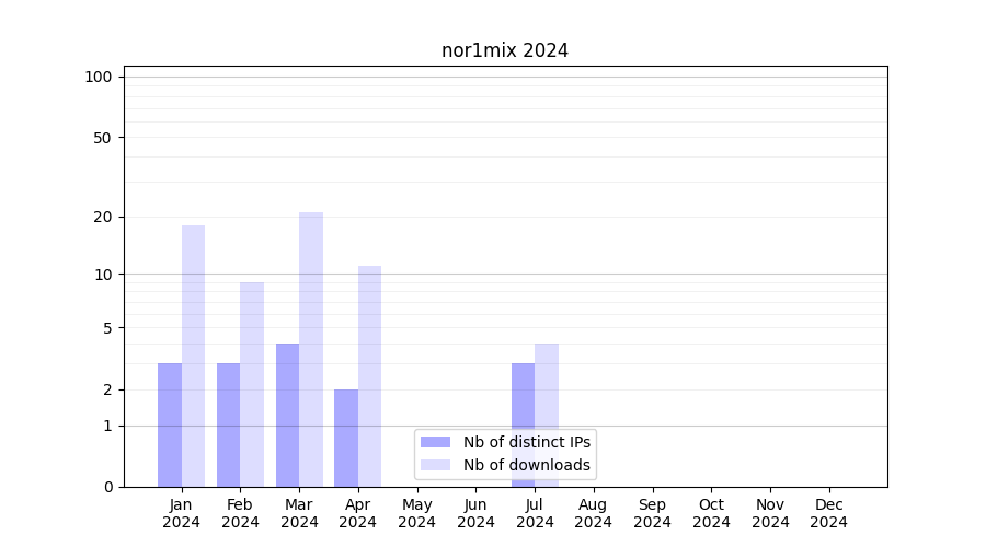 Number of downloads for software package nor1mix, year by year, from 2025 back to 2014 (years with no downloads are omitted):