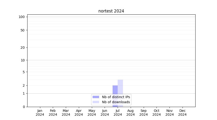 Number of downloads for software package nortest, year by year, from 2025 back to 2014 (years with no downloads are omitted):