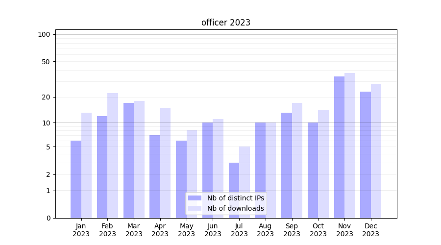 Number of downloads for software package officer, year by year, from 2025 back to 2014 (years with no downloads are omitted):