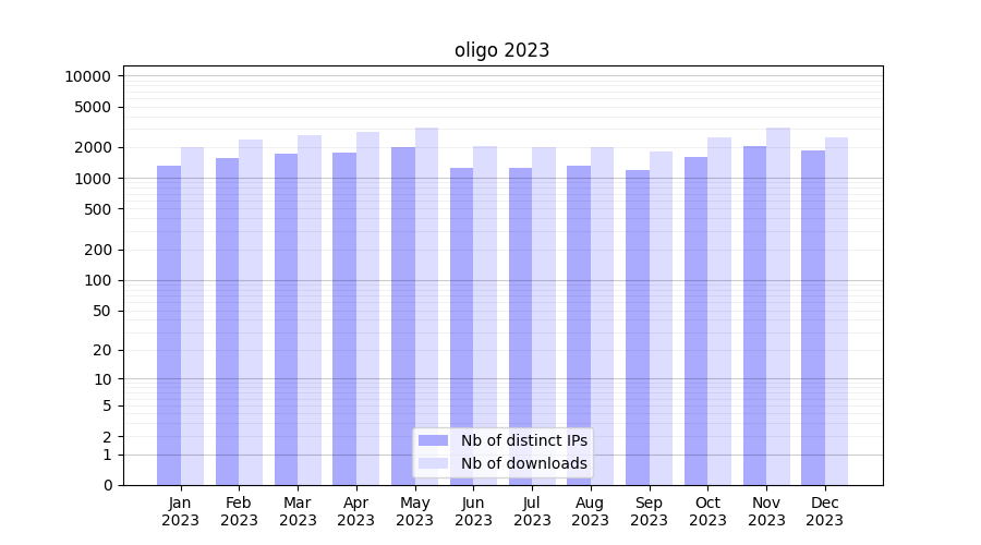 Number of downloads for software package oligo, year by year, from 2025 back to 2014 (years with no downloads are omitted):