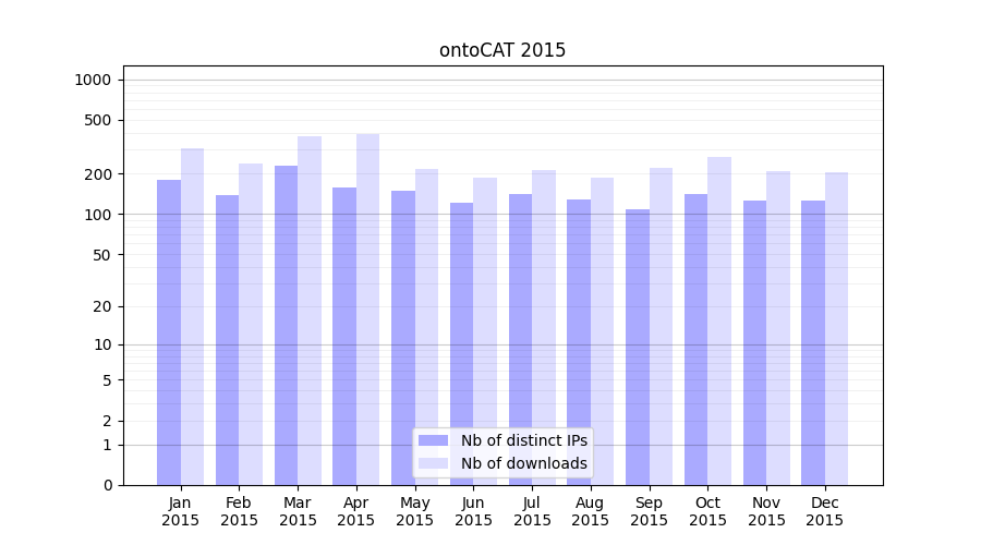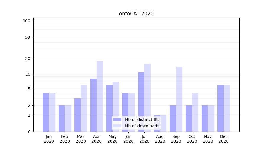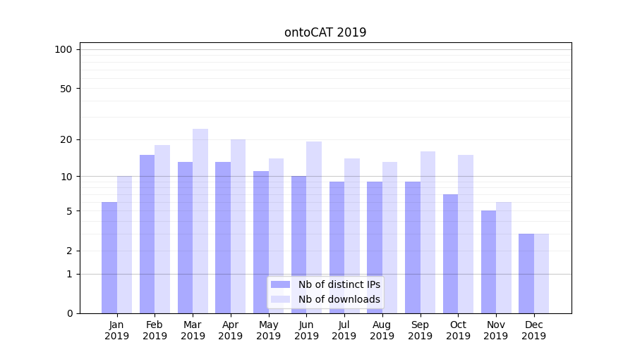Number of downloads for software package ontoCAT, year by year, from 2025 back to 2014 (years with no downloads are omitted):
