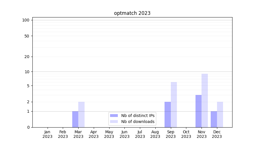 Number of downloads for software package optmatch, year by year, from 2025 back to 2014 (years with no downloads are omitted):