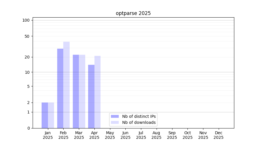 Number of downloads for software package optparse, year by year, from 2025 back to 2014 (years with no downloads are omitted):