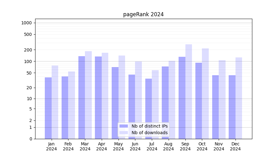 Number of downloads for software package pageRank, year by year, from 2025 back to 2014 (years with no downloads are omitted):