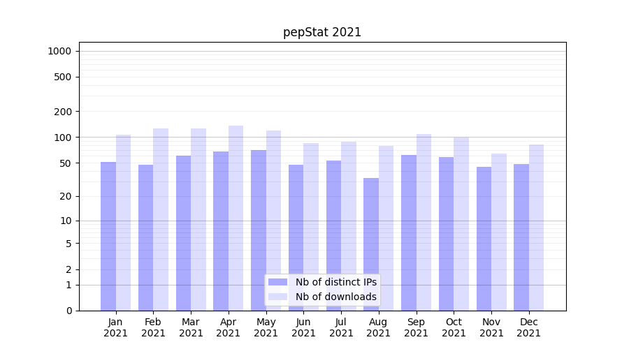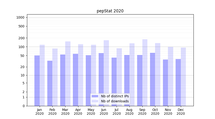 Number of downloads for software package pepStat, year by year, from 2025 back to 2014 (years with no downloads are omitted):