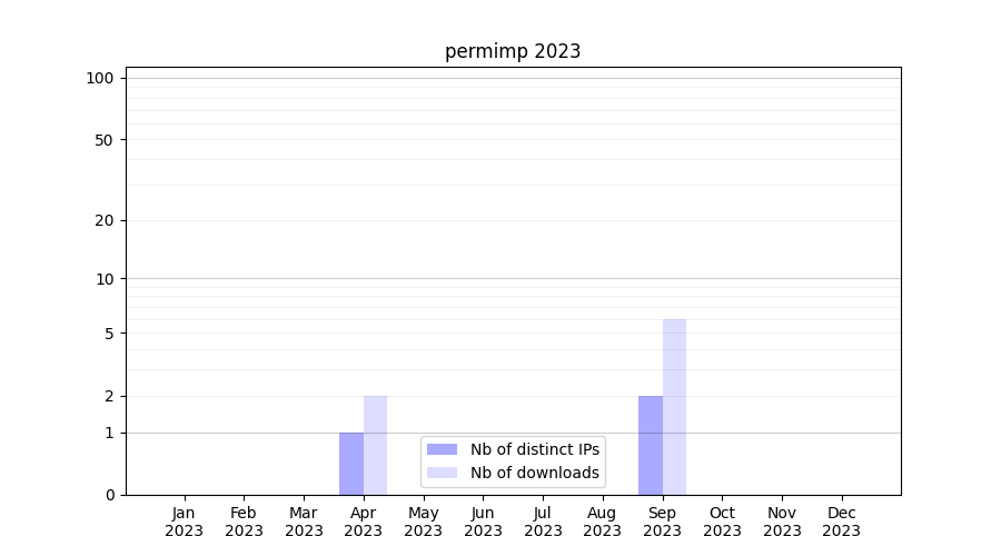 Number of downloads for software package permimp, year by year, from 2025 back to 2014 (years with no downloads are omitted):