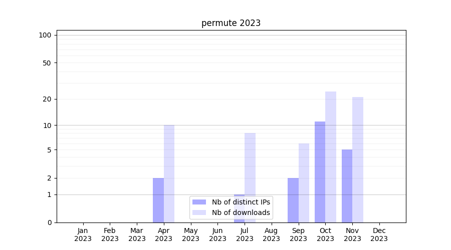 Number of downloads for software package permute, year by year, from 2025 back to 2014 (years with no downloads are omitted):