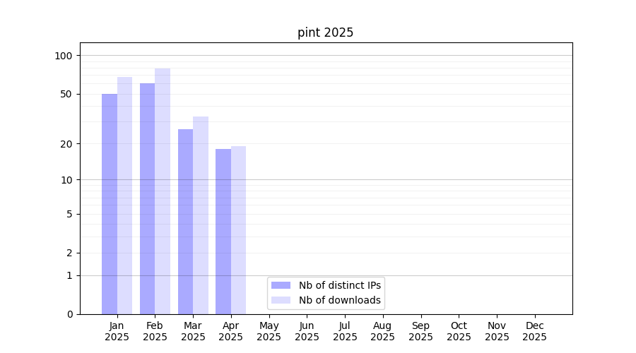 Number of downloads for software package pint, year by year, from 2025 back to 2014 (years with no downloads are omitted):