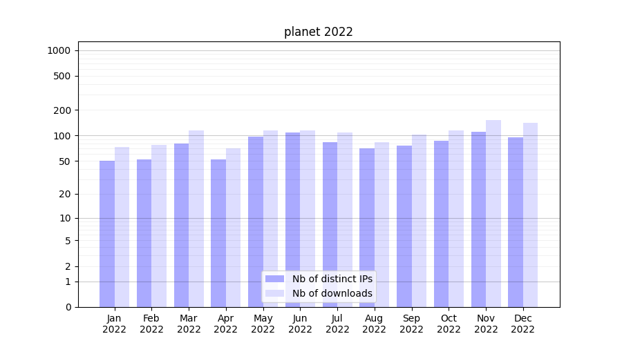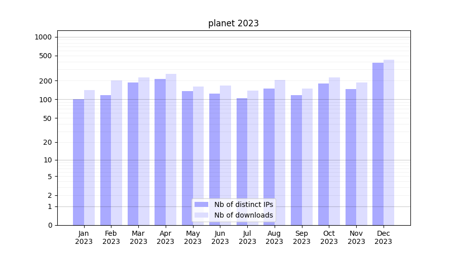 Number of downloads for software package planet, year by year, from 2025 back to 2014 (years with no downloads are omitted):