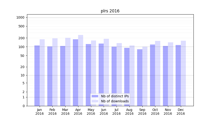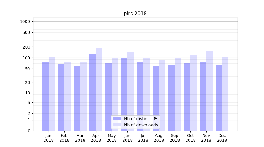 Number of downloads for software package plrs, year by year, from 2025 back to 2014 (years with no downloads are omitted):