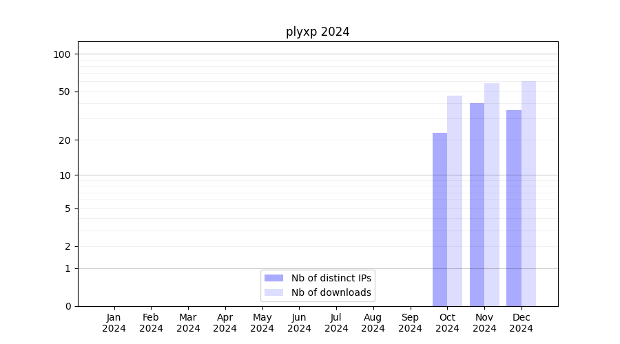 Number of downloads for software package plyxp, year by year, from 2025 back to 2014 (years with no downloads are omitted):