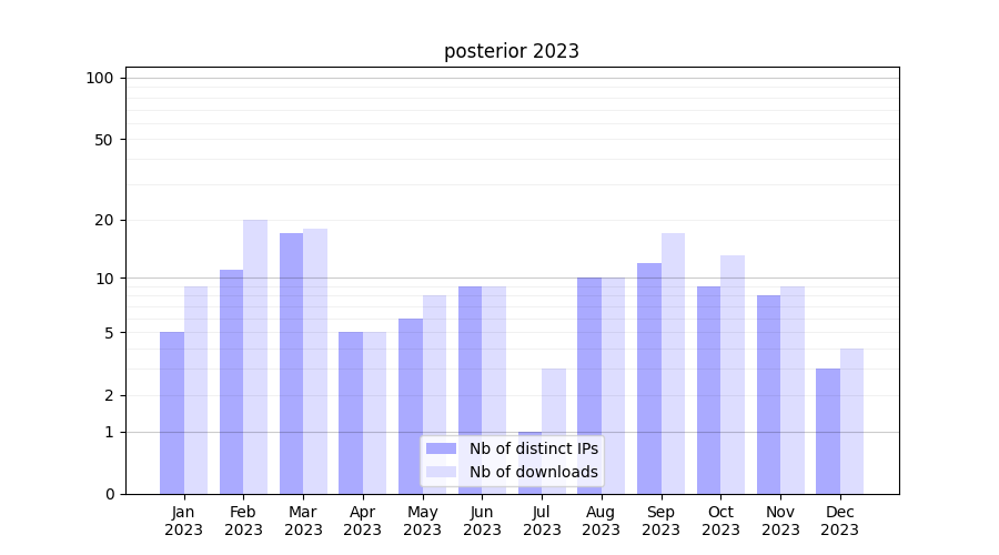 Number of downloads for software package posterior, year by year, from 2025 back to 2014 (years with no downloads are omitted):