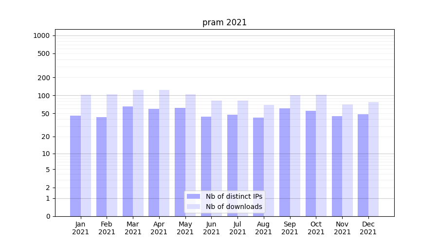 Number of downloads for software package pram, year by year, from 2025 back to 2014 (years with no downloads are omitted):