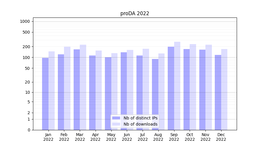 Number of downloads for software package proDA, year by year, from 2025 back to 2014 (years with no downloads are omitted):
