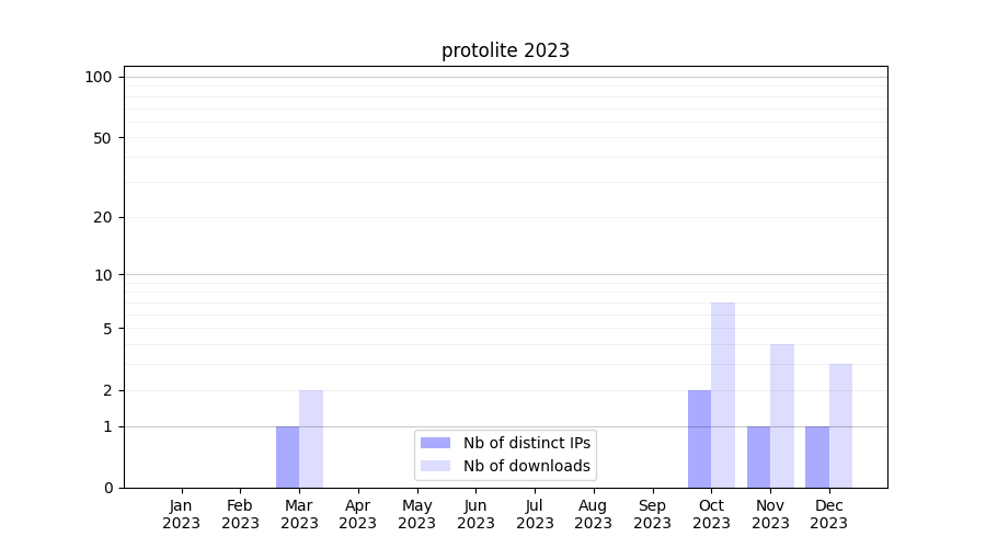 Number of downloads for software package protolite, year by year, from 2025 back to 2014 (years with no downloads are omitted):