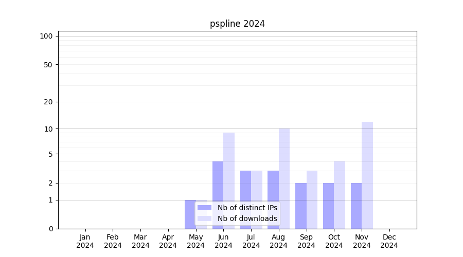 Number of downloads for software package pspline, year by year, from 2025 back to 2014 (years with no downloads are omitted):
