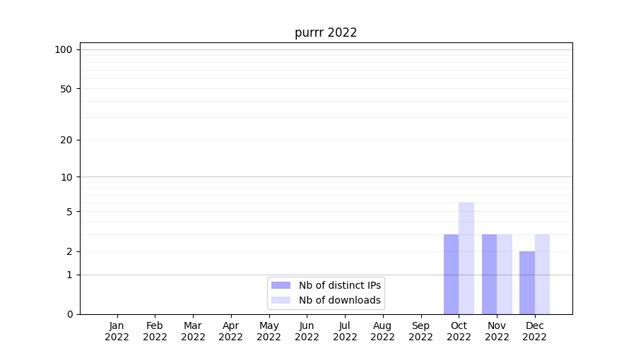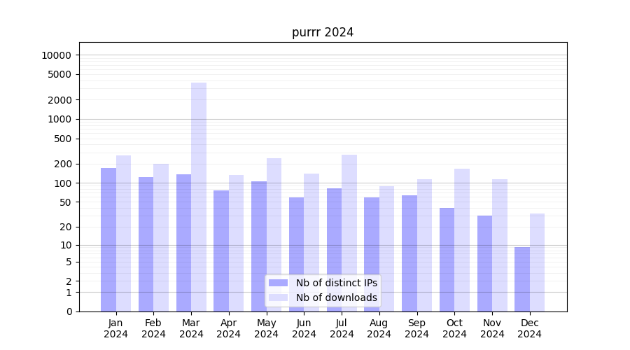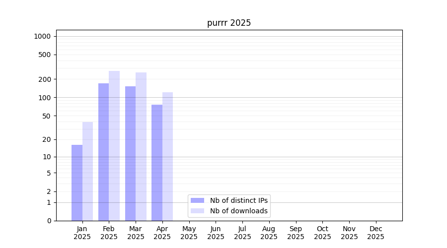 Number of downloads for software package purrr, year by year, from 2025 back to 2014 (years with no downloads are omitted):