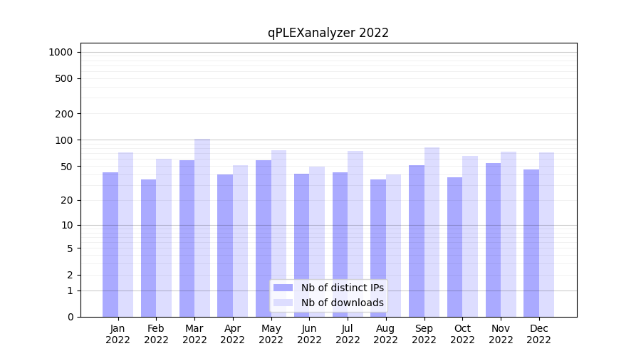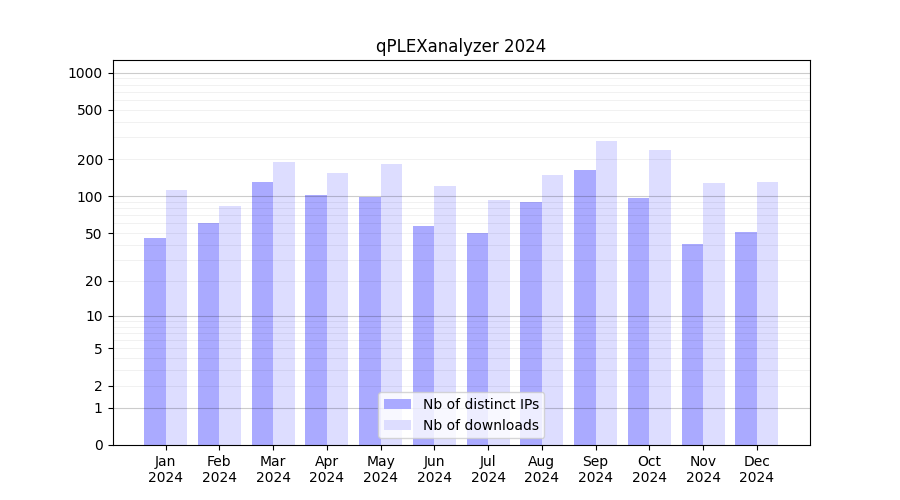 Number of downloads for software package qPLEXanalyzer, year by year, from 2025 back to 2014 (years with no downloads are omitted):