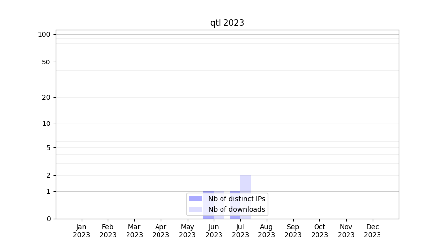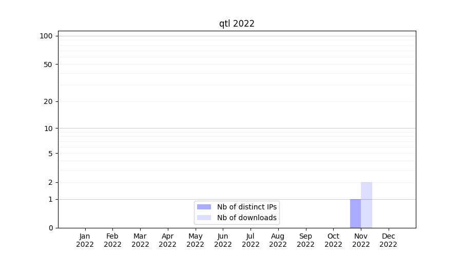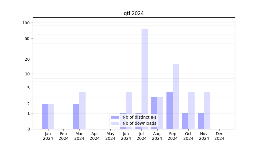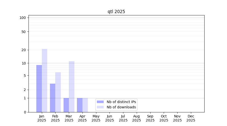 Number of downloads for software package qtl, year by year, from 2025 back to 2014 (years with no downloads are omitted):