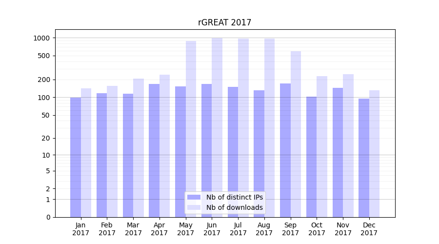 Number of downloads for software package rGREAT, year by year, from 2025 back to 2014 (years with no downloads are omitted):