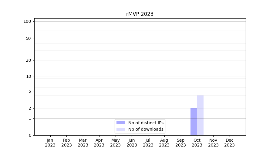 Number of downloads for software package rMVP, year by year, from 2025 back to 2014 (years with no downloads are omitted):