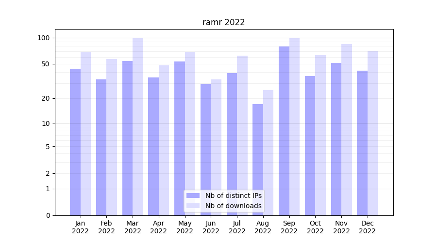 Number of downloads for software package ramr, year by year, from 2025 back to 2014 (years with no downloads are omitted):
