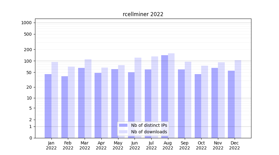 Number of downloads for software package rcellminer, year by year, from 2025 back to 2014 (years with no downloads are omitted):