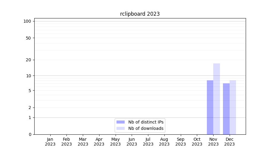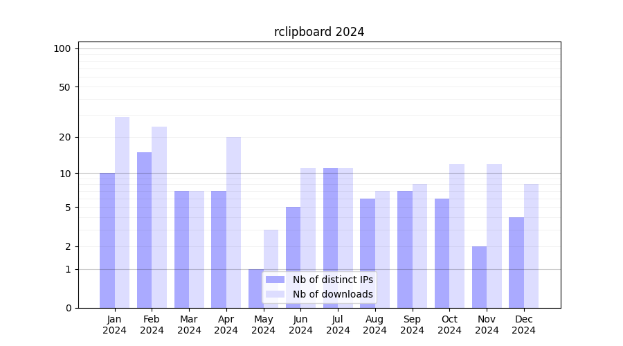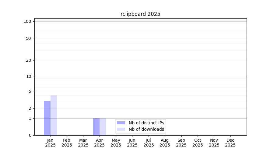 Number of downloads for software package rclipboard, year by year, from 2025 back to 2014 (years with no downloads are omitted):