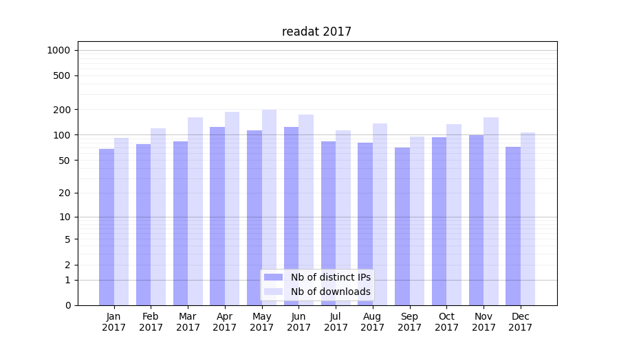 Number of downloads for software package readat, year by year, from 2025 back to 2014 (years with no downloads are omitted):