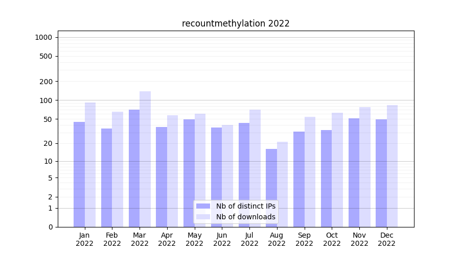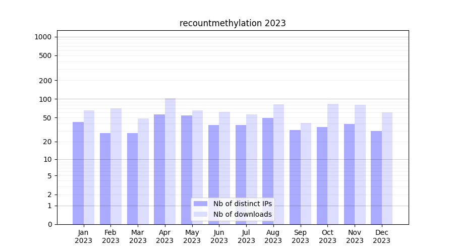 Number of downloads for software package recountmethylation, year by year, from 2025 back to 2014 (years with no downloads are omitted):