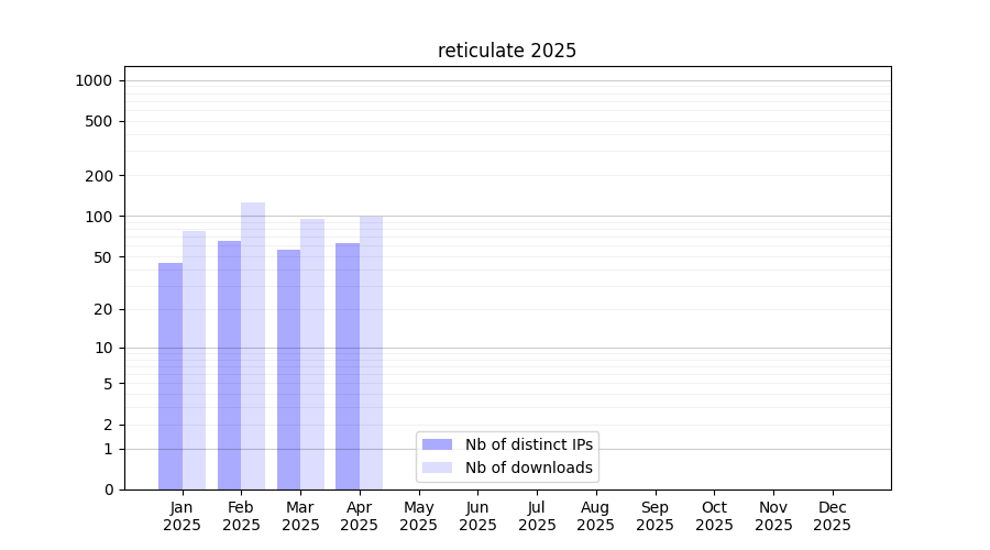 Number of downloads for software package reticulate, year by year, from 2025 back to 2014 (years with no downloads are omitted):