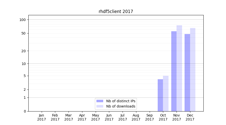 Number of downloads for software package rhdf5client, year by year, from 2025 back to 2014 (years with no downloads are omitted):
