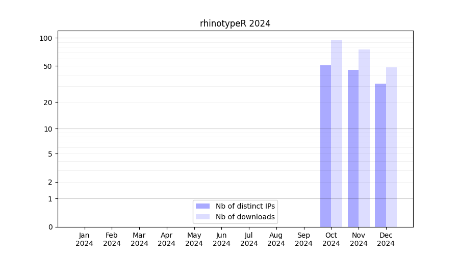 Number of downloads for software package rhinotypeR, year by year, from 2025 back to 2014 (years with no downloads are omitted):