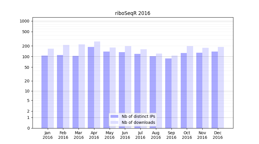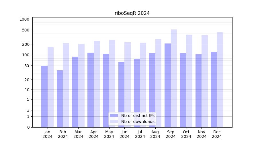 Number of downloads for software package riboSeqR, year by year, from 2025 back to 2014 (years with no downloads are omitted):
