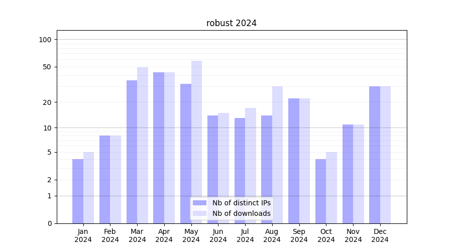 Number of downloads for software package robust, year by year, from 2025 back to 2014 (years with no downloads are omitted):