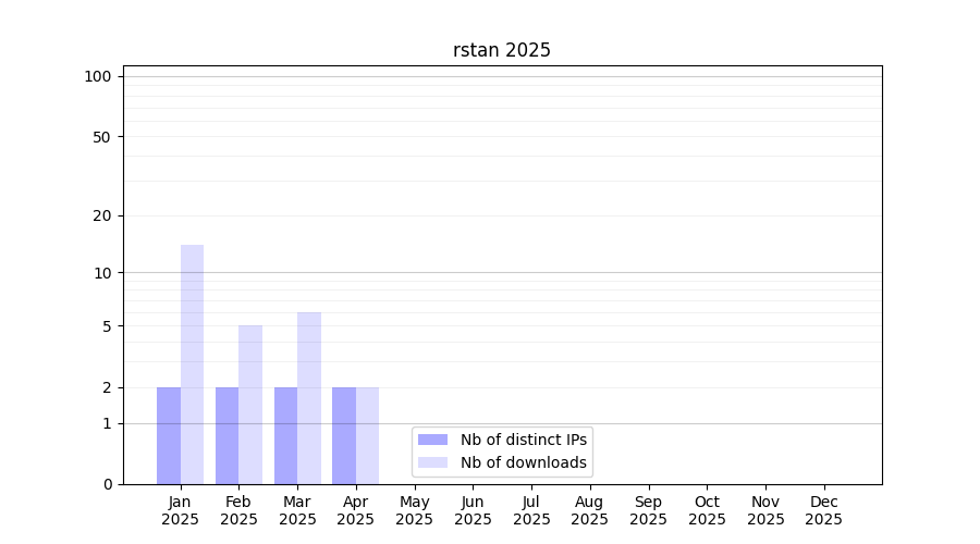Number of downloads for software package rstan, year by year, from 2025 back to 2014 (years with no downloads are omitted):