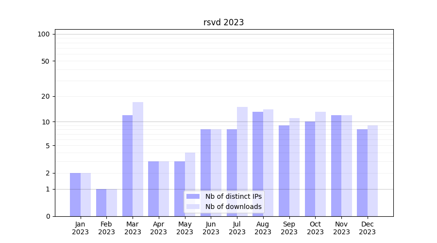 Number of downloads for software package rsvd, year by year, from 2025 back to 2014 (years with no downloads are omitted):