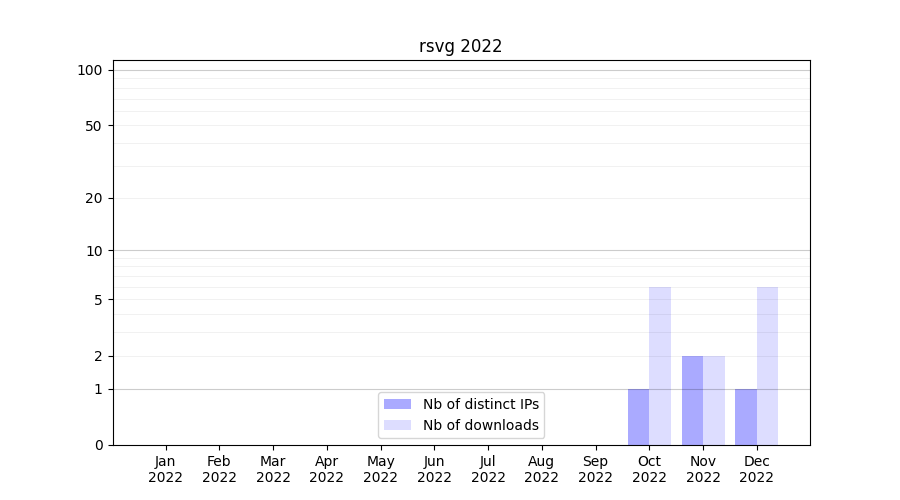 Number of downloads for software package rsvg, year by year, from 2025 back to 2014 (years with no downloads are omitted):