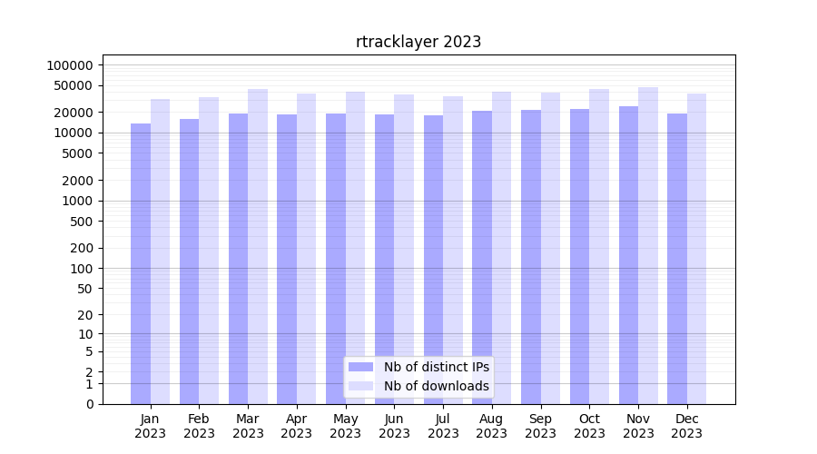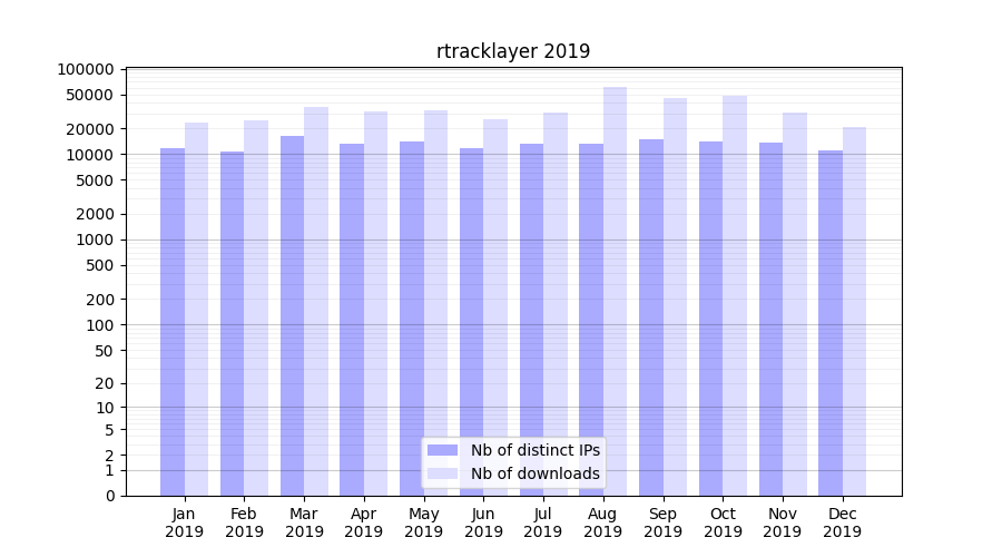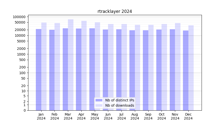 Number of downloads for software package rtracklayer, year by year, from 2025 back to 2014 (years with no downloads are omitted):