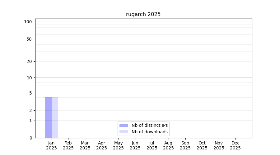 Number of downloads for software package rugarch, year by year, from 2025 back to 2014 (years with no downloads are omitted):