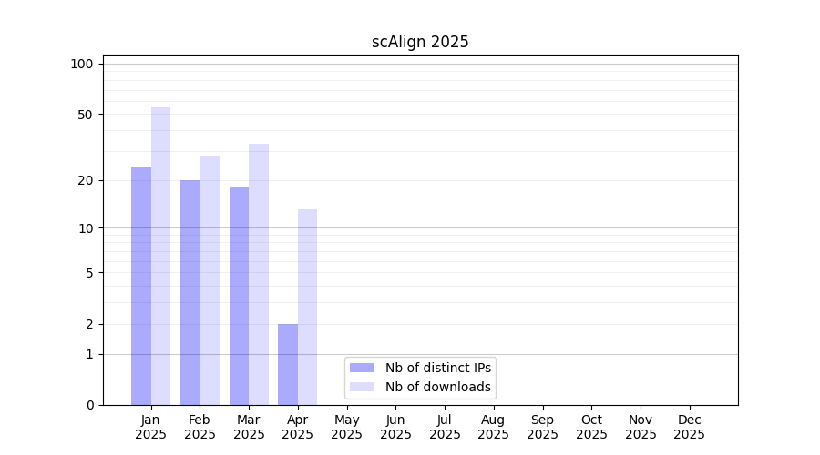 Number of downloads for software package scAlign, year by year, from 2025 back to 2014 (years with no downloads are omitted):