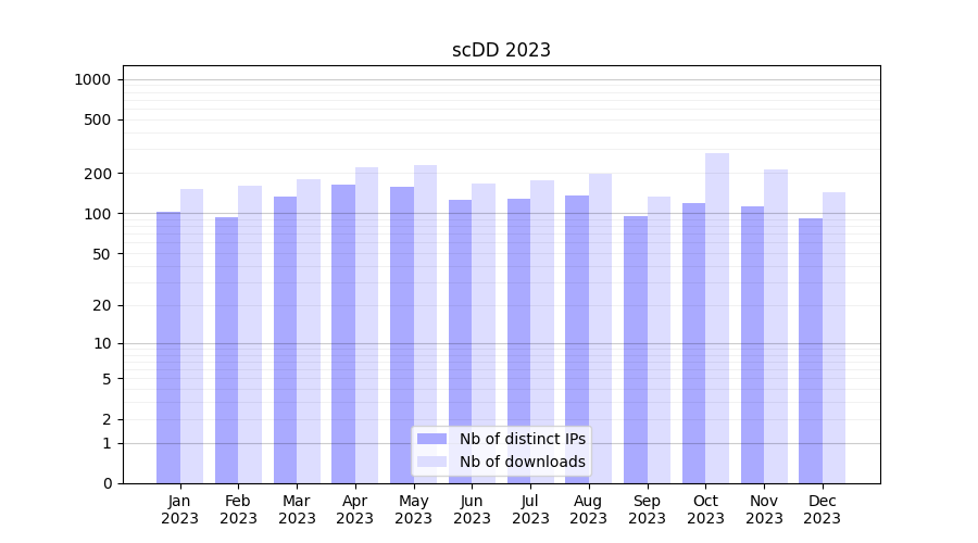 Number of downloads for software package scDD, year by year, from 2025 back to 2014 (years with no downloads are omitted):